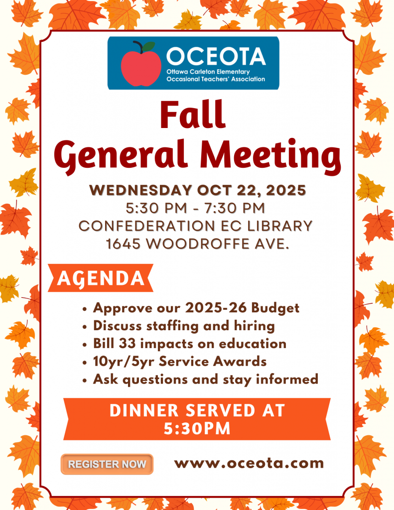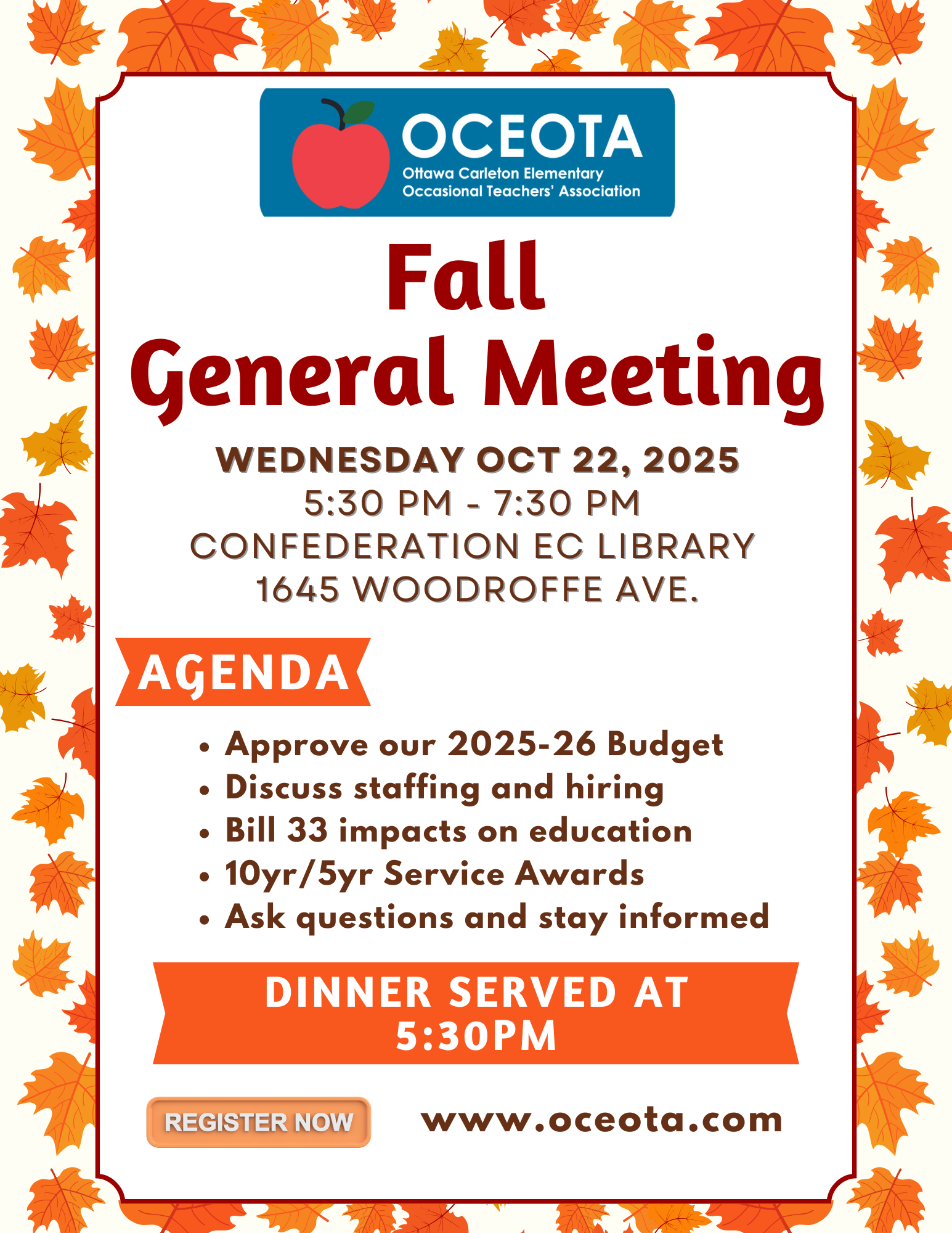 Please note that the Fall General Meeting will be held on October 22nd at Confed Education Centre. At this meeting OCEOTA Members may register to attend and vote on OCEOTA’s Final Budget for 2024-25 and Constitutional Amendments, enjoy a free dinner, ask questions, hear reports, and potentially win door prizes.