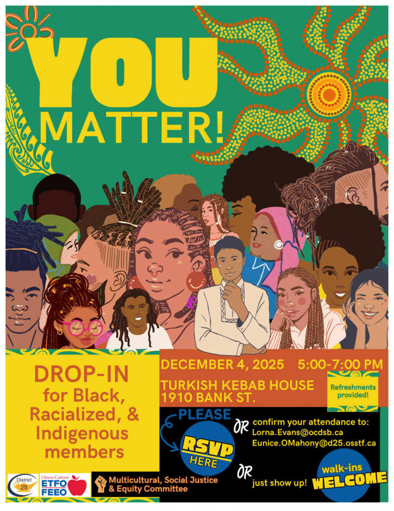 OTs have graciously been invited to attend OC ETFO’s Indigenous Education and Multicultural, Equity & Social Justice Committees, in conjunction with OSSTF, drop-in event for Black, Indigenous and racialized members at Turkish Kabob on December 4th.